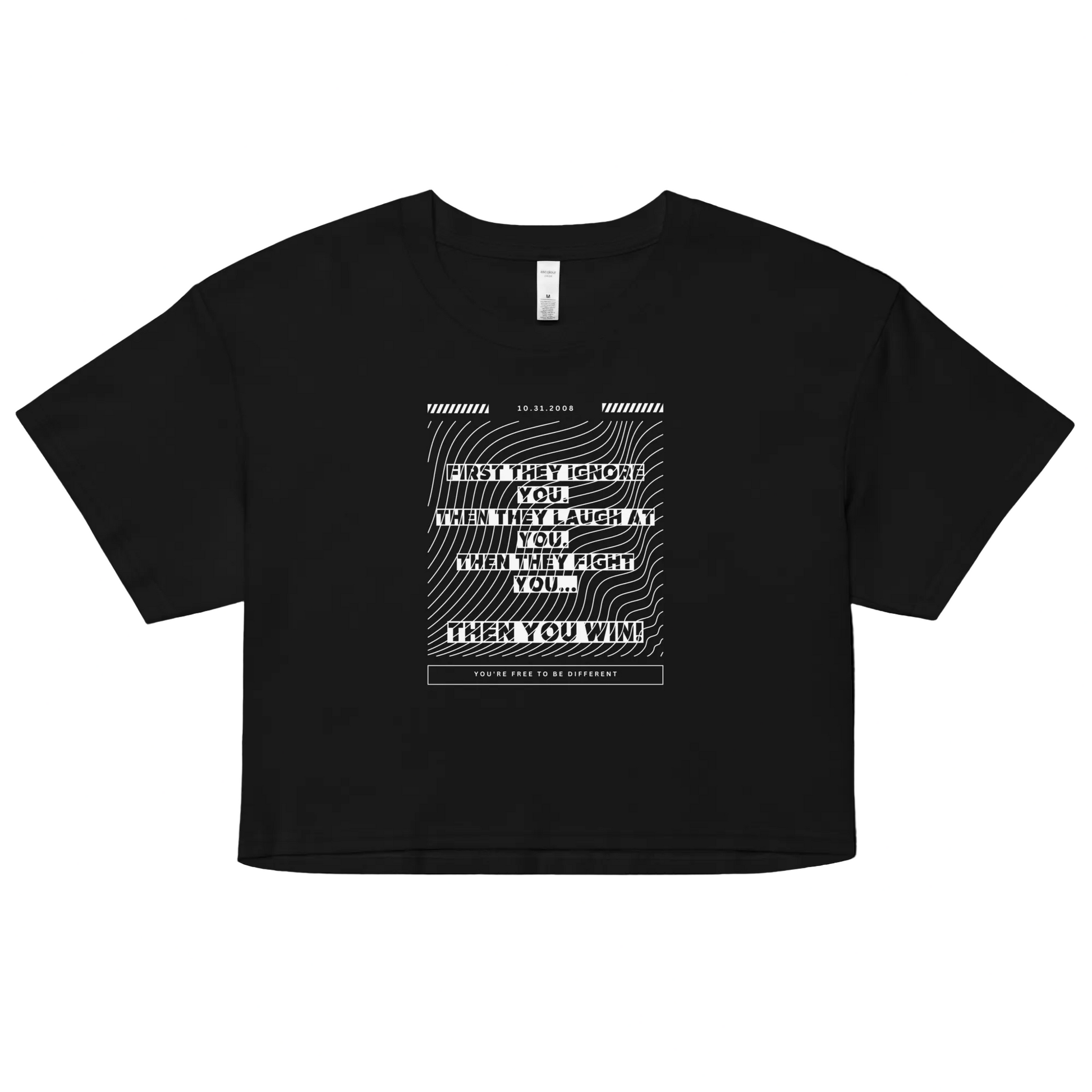 Embrace the journey of transformation with our "Stages of Change" Crop Top, featuring the empowering quote: "First they ignore you, then they laugh at you, then they fight you, then you win." This statement piece symbolizes resilience and perseverance, making it a meaningful addition to your wardrobe.